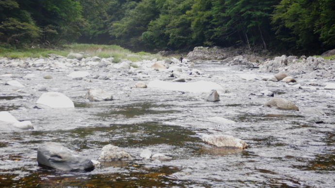上流に釣り人おひとり、もっと上流まで歩くつもりだったが、爺様はほんの数10m歩いたところで竿を出してみることにする。