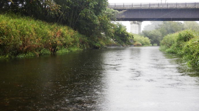 上流からは木の葉や刈草が流れてくる中を300mほど釣り下った。